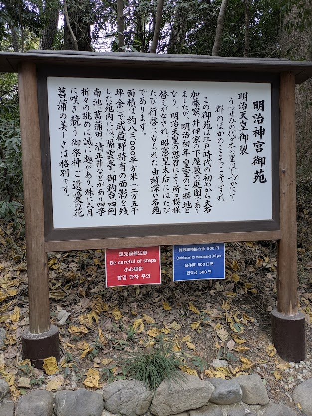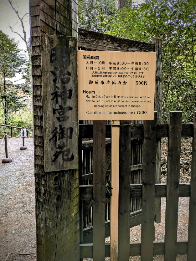 明治神宮は無料だが、南参道から入る御苑はシニア関係なく大人500円(維持協力金)